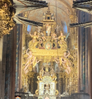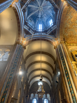 Later that day we entered the magnificent Cathedral for the Pilgrim's Mass service, which occurs at noon and 19:30 every day. As a symbol of welcome, the Mass always begins with a reading of the list of pilgrims (by nationality) who have arrived in Santiago and that have claimed their 'Compostela' within the last 24 hours. Although all in Spanish I listened carefully to the reference to the number of British and Irish pilgrims arriving as this number included my husband and I. I was delighted towards the end of the service when it was obvious that the 'botafumeiro' was going to be used. The famous botafumeiro of Santiago de Compostela Cathedral is an enormous incense burner used for liturgical purposes. It weighs in at 100kg once filled with coal and incense. Its swaying across the length of the naves of the church has become known throughout the world. The Galician word, used to name it since the 19th century, literally means smoke expeller and it expels clouds of incense as it swings. Apparently it can reach speeds of up to 70 km/h and was historically used to cover up the smell of pilgrims looking for shelter inside the cathedral at night. The botafumeiro isn't used at every service and in fact I was disappointed to hear during our Camino from others than knew more than me, that there are only a few religious days each year now that it's used and the regular Friday 'swinging of the botafumeiro' was no longer in place. It is also used on other certain occasions, but this is never advertised in advance. I therefore hadn't held onto any expectations about seeing it, so this was a wonderful surprise to finish off what had been an extraordinary day.