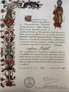The next 'job' we needed to do was register our arrival with the Pilgrim's Office, so we headed straight there. You can register online in advance, but if not, you are met by a very surly and large security guard on the door who won't let you in, and points you to a notice where you can download a QR code to register there and then on your phone. It takes a matter of minutes. You're then ushered through the main entrance, issued with a number and wait in line until your number is called. There were around 10/12 counters open to deal with the number of pilgrims coming through the doors that afternoon and we waited for less than 5 minutes to be called forward. If you've seen the film "The Way" you'll maybe remember the scene towards the end following the pilgrims' arrival where each is asked their reason for walking the Camino and then a carefully hand-written certificate is handed to them, the ink still wet on the parchment. Much dialogue seems to take place between the pilgrims and the registrars and each are congratulated on reaching Santiago and their journeys completed. My experience was a little different. Everything is now electronic so apart from checking a few basic facts, I was handed two pieces of paper: my 'Compostela' to confirm that I had completed the Camino Francés, and my 'certificate of distance' to confirm how far I'd come. The very pleasant lady dealing with me did congratulate me on my achievement as she handed me my two pieces of paper. My husband then tried to take a photograph of me receiving my 'awards' but was quickly shouted at (very loudly) by another security guard and told to wait until we got outside to take any photos! As we queued up at a separate desk to pay the 2€ for our certificates I suddenly noticed that my name had been spelt incorrectly on one of the certificates, which I couldn't understand as I'd registered for both using the same data and the other certificate was correct. I was just about to return to ask for it to be re-printed when my husband informed me very politely that although one certificate is in Spanish, the other is in Latin, so indeed my name should be written as 'Stephaniam' and not 'Stephanie'!
